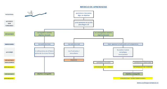 En Coaching no hablamos de fracasos, sino de errores, que es lo que nos permite mejorar el procedimiento, dandonos la oportunidad de volverlo a intentar, con lo que adquirimos un aprendizaje. Cuando lo consideramos un fracaso, no cambiamos y nos quedamos quietos. Entonces no hay aprendizaje, sino inmovilismo, resignación y argumentos que justifiquen el resultado.El Aprendizaje de segundo orden es cuando, en lugar de cambiar la acción, cambiamos el observador que somos. Es decir, nosotros actuamos como actuamos porque cada uno de nosotros somos un compendio de creencias, experiencias, emociones, sentimientos, valores, etc. que nos hace ser únicos y actuar de una determinada manera. La mejor que conocemos. Ahora bien, si somos capaces de indagar el tipo de observador que somos, comprobando las creencias que nos acompañan, seremos capaces de distinguir cómo observamos el mundo que nos rodea y ello nos permitirá intervenir en nosotros mismos, cambiando las gafas con las que miramos o filtros que nos hacen movernos en la dirección que hemos elegido. Así, nos permitirá conocer que siendo de otra forma, cambiando nuestros juicios, podemos tener resultados diferentes.